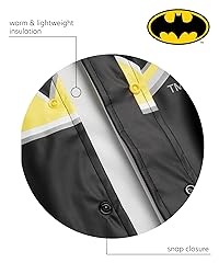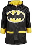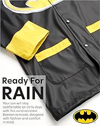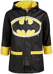 OFFICIALLY LICENSED WARNER BROS: Warner Bros raincoat for boys with Batman logo print and 3D hood; Entertaining the World; Express your style and tell your own story BOYS' BATMAN RAINCOAT: This multipurpose and versatile Batman raincoat is a must-have for your little boy that will help him stay safe from the elements when the weather changes suddenly; Perfect jacket for all little fans of the Warner Bros cartoons and characters, featuring a big and vibrant Batman logo FUNCTIONAL SLICKER SHELL: Let your boy stay warm and dry without being too bulky; With this fashionable Batman windbreaker raincoat for boys, featuring a Batman logo, your son will enjoy a warm yet lightweight insulation against the elements; Convenient hood guarantees extra warmth and grants an additional level of protection against unfavorable weather conditions DURABLE JACKET: We fashioned this Batman coat from wind and water resistant fabric that will ensure your son stays comfortable when the temperature drops; Great waterproof jacket for everyday wear, school, and outdoor play in the rain; Our Batman raincoat is perfect for every baby boy and girl who love the popular Batman cartoon and movies COMFORT FIT: Comfortable windbreaker and raincoat in one for boys and girls comes in a variety of sizes to ensure a perfect fit; Adorned with a colorful Batman logo print, this windbreaker is a perfect gift idea for sons, brothers, nephews, grandchildren, cousins, and friends; Get this quality Batman merchandise for your boy's next birthday or Christmas