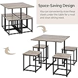 • Industrial 5-Piece Dining Room Set with 1 Square Table, 4 Backless Stools, Space Saving Kitchen Table Set Want a compact table set to uplift your dining space? This square wooden&metal table set provides you a perfect dining area without taking up too much room. Made of premium engineered wood and a sturdy iron frame, this dining set is sturdy and durable for long serving time. Each set includes 1 table and 4 stools, so you and your family or friend can enjoy a quick breakfast or afternoon coffee cozily. With a space-saving design, you can store these four stools under the table when not needed. This set comes with a stylish rustic flavor, while the clean-lined silhouette makes it more sleek and modern. Great for the dining room, kitchen, living room, bar, apartment, etc. Specifications: Material: MDF, iron Color: Gray + Black Table Dimensions: 80 cm L × 80 cm W × 75 cm H / 31.5″ L × 31.5″ W × 29.5″ H Stool Dimensions: 36 cm L × 36 cm W × 42.5 cm H / 14.5″ L × 14.5″ W × 17″ H Item Weight: Table: 10.9 kg / 24 lb, Stool(ea.): 3.4 kg / 7.4 lb Shipping Weight(the set): 27.8 kg / 61.2 lb Maximum Weight Capacity: Table: 60 kg / 130 lb Stool(ea.): 80 kg / 175 lb Note: 1. Please allow ±1cm/0.5'' measurement tolerance. 2. For your safety, please do not stand on the table or stool. perfect for Airbnb space/ small attic apartment/small apartment/single wide trailer/small space