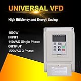 - VFD Variable Frequency Drive,Single‑Phase 110VAC Input 3‑Phase 220VAC Output Variable Frequency Inverter,Motor Speed Controller,220V 1500W AT5‑1500X Feature: 1. The frequency converter is used to adjust the speed of the motor and has the characteristics of high torsion and wide speed regulation. 2. The speed governor is equipped with a digital display, with clear readings and convenient parameter setting. 3. Made of high‑quality plastic material, and impact resistance, and has good safety. 4. With of over current, over voltage and under voltage, module failure, over heat, short circuit, etc., and provide low electromagnetic interference 5. The variable frequency inverter is suitable for 3‑phase motor speed regulation, lighting adjustment, power cooling, etc. Specification: Item Type: Inverter Material: Plastic Model: AT5-1500X Power: 1500W Power Phase Number: Single phase Input: Single-phase 110VAC Output: 3-phase 220VAC Power Supply Voltage: 110VAC 50/60Hz Mode: Overcurrent, overvoltage and undervoltage, module failure, overheating, short circuit, input and output phase loss, abnormal motor parameter adjustment, electronic thermal relay, etc. Package List: 1 x Inverter1 x User Manual Note: This inverter is suitable for use with a 3‑phase motor with a voltage of 220V. Please confirm whether your device is compatible with the product before purchasing.