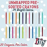 IDIY Paper-Less Pre-Sorted Crayons - 24 colors - 480 pc total Bulk Crayon kit comes with 20 of each color Child safe and non-toxic - safety tested and great for kids, teachers, schools, and classrooms Bulk wax crayons perfect for any art or school project Quality Crayons that can melt when used on direct heat sources