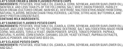 10 Count Lay's Mix Includes: (3) Sour Cream & Onion Flavored Potato Chips, (3) Barbecue Flavored Potato Chips, & (4) Classic Potato Chips It all starts with farm-grown potatoes, cooked and seasoned to perfection. So every LAY'S potato chip is perfectly crispy and full of fresh potato taste. Happiness in Every Bite. Quick & convenient for work snacks, school snacks, road trips, lunch snacks, and more. Individual portions are perfect for portion control and snacking on-the-go