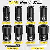 TIGHT GRIP AND BIT: The internal reverse spiral design of the extractor provides excellent torque and can easily extract damaged bolts and nuts.Can be used with most tools, such as impact wrenches, manual and pneumatic ratchets, hexagonal wrenches, flat-end wrenches, adjustable wrenches, pliers and sockets. SUPERB PRODUCTION PROCESS: The bolt nut remover is made of Cr-Mo steel(chromium molybdenum steel). Each bolt extractor is precisely CNC machined to meet or exceed ANSI performance standards and surface is coated with a black oxide coating designed, the hardness reaches 60HRC, with excellent impact resistance and durability and service life. VARIOUS SIZES AND USES:The lug nut extractor socket set is available in eight different sizes, including 14mm, 16mm, 17mm, 19mm, 21mm, 22mm, 24mm, 27mm and an extra metal rod.It can meet various needs of daily needs, whether it's car repair, home decoration, or process production, and can provide you with great convenience. EASY TO USE: You only need to use a hammer to hit the removal tool onto the damaged nut, then select the 1/2 inch square drive wrench to loosen the nut counterclockwise to remove these rusted nuts. EASY TO STORE: All bolt nut removers are placed in a storage box, easy to access at any time.If you encounter any problems while using our products. Please contact us by email, our professional after-sales team will contact you and solve your problems in time.