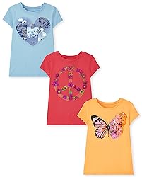 GRAPHIC TEE — A classic, comfortable fit with graphics she'll love FABRIC — Tahoe Blue style made of 60% cotton/40% polyester jersey; Light Siam and Tuscan Sun style made of 100% cotton jersey DESIGN — Features a rib-knit crew neck and short sleeves MULTIPACK — Pack of 3 graphic tees: 1 tee with heart butterfly graphic design at front; 1 tee with butterfly floral graphic design at front; 1 tee with floral peace sign graphic design at front THE CHILDREN'S PLACE — We offer a huge selection of kid's clothing! Shop us for jeans, shorts, leggings, chinos, polo shirts, dresses, uniforms, pajamas, and accessories.