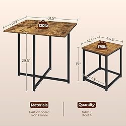 - Industrial 5-Piece Dining Room Set with 1 Square Table, 4 Backless Stools, Space Saving Kitchen Table Set Want a compact table set to uplift your dining space? This square wooden&metal table set provides you a perfect dining area without taking up too much room. Made of premium engineered wood and a sturdy iron frame, this dining set is sturdy and durable for long serving time. Each set includes 1 table and 4 stools, so you and your family or friend can enjoy a quick breakfast or afternoon coffee cozily. With a space-saving design, you can store these four stools under the table when not needed. This set comes with a stylish rustic flavor, while the clean-lined silhouette makes it more sleek and modern. Great for the dining room, kitchen, living room, bar, apartment, etc. Specifications: Material: MDF, iron Color: Rustic Brown + Black Table Dimensions: 80 cm L × 80 cm W × 75 cm H / 31.5″ L × 31.5″ W × 29.5″ H Stool Dimensions: 36 cm L × 36 cm W × 42.5 cm H / 14.5″ L × 14.5″ W × 17″ H Item Weight: Table: 10.9 kg / 24 lb, Stool(ea.): 3.4 kg / 7.4 lb Shipping Weight(the set): 27.8 kg / 61.2 lb Maximum Weight Capacity: Table: 60 kg / 130 lb Stool(ea.): 80 kg / 175 lb Note: 1. Please allow ±1cm/0.5'' measurement tolerance. 2. For your safety, please do not stand on the table or stool. Package included: 1 x Dining Table 4 x Stool 1 x Instructions
