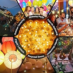 Color: 100pcs yellow lights, non-blinking, safe for indoor and outdoor use with super-bright LED lights Mini Ball Lights: Perfect for paper lanterns, balloons, party décor, wedding décor, Christmas, Halloween, and more; Add a “wow” factor to any wedding, engagement party, disco, camping, barbecue, or any other event where your imagination can shine Easy Operation: These lights are easy to use; Simply pull out the insulation film before placing them into balloons, paper lanterns, vases, bottles, or any centerpieces you desire Ultra Long-Lasting: Bright LED lights with power-saving features ensure a long service life; Includes 2 x 1.5V LR41 batteries; The lights work for 12-13 hours, with optimal brightness for 4-5 hours Reusable Balloon Lights: You can turn off the light by putting the tabs back into the slot to save battery life; If you plan to reuse the lights, save the little tabs that you pull out to activate them; The replacement batteries are LR41 Balloon Light Usage Note: This balloon light can be temporarily placed in water for ornamental display only—water seepage may cause battery rust over time, do not place in wine or any edible drinks; Contains batteries, decorative item only, not a toy; please keep away from young children and pets