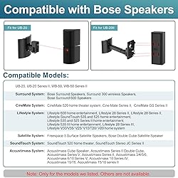 ---Compatible---Ceiling mount /wall mount bracket for Bose UB-20, UB-20 Series II, WB-50 Series II, UFS-20 Series II, UTS-20 Series II- For Bose Surround Speakers, Lifestyle 600 home entertainment system- For CineMate 520, CM520, Cine Mate Series II, GS Series II, Virtually Invisible 300- For Lifestyle SoundTouch 300 535 525 520 600 535III 525III ST535 ST525 ST520 home system, Stereo JC Series II Wi-Fi music system ---Also Compatible---Ceiling mount & wall mount bracket for Acoustimass 3, Acoustimass 5, Acoustimass 6 Series V, Acoustimass 6, Acoustimass 10 Series V, Acoustimass 10 Series IV, Acoustimass 15, Acoustimass 16 Series II, Acoustimass Series V, Acoustimass Series II Double Cube, Acoustimass Series II- For Lifestyle V35, V25, V10, T20, V20, V30 home system, Lifestyle 28 Series III system ---2-in-1 Mount for Bose Speakers---Not just a wall mount, but also a versatile ceiling mount. Designed specifically for Bose speakers mount, it offers flexible installation anywhere, no matter inside or outside.(Verify compatibility with listed Bose models, not suitable for all). Elevate your audio setup now! ---Optimize Your Listening---Up to 170º tilt and 180º swivel, for an immersive listening experience wherever you are. (Please note: Maximum angle adjustment varies with installation method). ---Clear Instructions--- Easy to Follow and Install: Just follow the instructions, easy assembly and install. And we also pack with necessary gadgets, no worry about interrupting the assembly! ---Save Your Space--- Wall mount bracket perfect for mounting on the wall or ceiling, get enough space. Keep the table away from clutter, making your home more cozy and tidy. ---Great Gift---Presented in a stunning package, this speaker stand bracket for Bose is an excellent choice for gifting friends and family during the holiday season, offering both considerate thoughtfulness and practicality. ---Sturdy Construction---Engineered with robust metal materials, our bracket provides a stable platform, support up to 10lbs/4.5kg, keeping your Bose speaker secure and steady. ---Package Included---2 x Wall mounting bracket for Bose speaker, 1 x Hardware Kit, 1 x Instructions