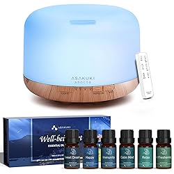 5-IN-1 AROMATHERAPY DEVICE: This ultrasonic essential oil diffuser is an amazing multi-functional aromatherapy device unlike any other you've ever used. It features a large and easy to clean 500ml water tank, 7 LED light colors, multiple mist nebulizer modes and remote control, as well as a safety auto-switch that prevents it from overheating in case it runs out of water. ULTRA-QUIET FAN: With the upgraded ultra-quiet fan, the diffuser is quieter than ever. The noise level is lower than 23 dB, which is quieter than gentle sound of breathing. You can enjoy the relaxing and fragrant atmosphere at your space anytime. CONVENIENT REMOTE CONTROL: Our diffuser comes with an easy to use remote control that can control it from up to 16.5-feet and change the lighting and misting modes as well as set the humidifier's timer. The LED light can be fixed or cycled through. The diffuser has 60/120/180 minute timers and steady ON mode. You can also set intermittent mist via the remote control. Essential Oil Blends: Introduce the long-lasting, pleasant, and relaxing aroma to your home with our Well-being aromatherapy diffuser oils set! Happy, Calm Mind, Air Freshening, Relax, Immunity, and Sweet Dreams inclued for your well-being and happy life Why ASAKUKI Blend Essential Oils: We believe compound oil that mixed with more than two single essential oils can achieve a specific effect. The more notes in the blend oil, the more lasting and rich it is! Just Try It