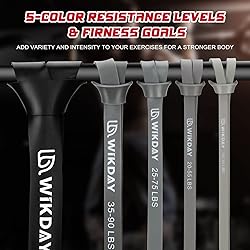 - With WIKDAY Resistance bands set, you can perform resistance band exercise anytime and anywhere, easy to carry, home, gym, outdoor, office or even on the go; your all in one rehabilitation mobility and exercise bands. Material:Environment-friendly natural latex materials, Non-toxic, no odor, anti-slip and curled. 5 Different Levels:●#1Gray Band 15-35 LBS: 2080x12x4.5mm/81.9x0.47x0.2inch/109g/3.85oz/15-35 LBS●#2Gray Band 20-55 LBS: 2080x15x4.5mm/81.9x0.59x0.2inch/137g/4.83oz/20-55 LBS●#3Gray Band 25-75 LBS: 2080x19x4.5mm/81.9x0.75x0.2inch/173g/6.1oz/25-75 LBS●#4Gray Band 35-90 LBS: 2080x29x4.5mm/81.9x1.14x0.2inch/264g/9.31oz/35-90 LBS●Black Band 60-170 LBS: 2080x50x4.5mm/81.9x1.97x0.2inch/454g/16.01oz/60-170 LBS●Strong Door Anchor with carabiner WIKDAY Professoinal resistance bands of 5 different levels #1Gray Band 15-35 LBS:Low resistance for warm-up ,stretching and yoga .Suited for beginners and teenagers,suited for speed training .#2Gray Band 20-55 LBS: Low resistance for warm-up, stretching and light strength training. Perfect for shoulder training and other high performance speed training.#3Gray Band 25-75 LBS: Light to medium resistance to mobility exercises and stretching. Well suited for high stretch training / stretching#4Gray Band 35-90 LBS: Moderate to severe resistance for moderate fitness exercises and strength training. Also suitable as medium support for pull-ups.Black Band 60-170 LBS: Heavy resistance for heavy weight training, strong support in pull-ups. Perfect for speed and agility training such as push ups, squats, bench presses and other exercises.Meet your different needs.warm-ups,stretching,jumping, speed training, aerobics, biceps curls,larger weight training exerci