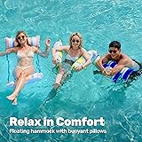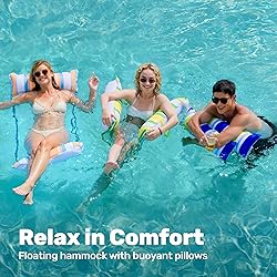 - JOYIN 3 PCS Inflatable Hammock, Water Lounge with Colorful Strips and net, Multi-Purpose Pool Float for Pool, Outdoor, BeachSUPER VALUE. Includes: 3 PCS Inflatable Pool Hammock have three colors (Blue, Green, Purple)PRIME QUALITY. Product made with Oxford cloth, durable and tear resistant. Can hold 1 adultWIDE USAGE. This Pool Hammock is easy to use and can convert into any use you need. For instance, you can make it a Hammock for taking a sunbath and relaxing in the beach resortENDLESS FUN. Choose from the colors you and your friends or family like and go for fun at the pool or beach. Easy to distinguish your own one by having a unique colorEXCEPTIONAL CARE: We're big on the little things. That's why customer safety and satisfaction are at the heart of everything we do. Contact us if products don't meet your expectations. We look forward to ensuring every moment brings you joy.