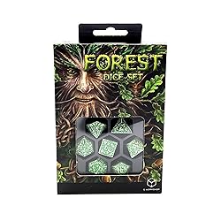 • The Green against all odds. The Forest Dice Set is one of the oldest designs in Q Workshops portfolio, and its about time for a refurbishing touch. The vivid 3D engravings of leaves surrounding legible digits look astonishing with contrasting colors of snow white and lush green. These dice remind us of a forest during a long winter slumber or one growing in a region of everlasting cold. journey begins