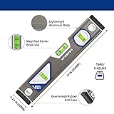 High Visibility - The 10" Torpedo Level is equipped with 3 separate vials for easy leveling: horizontal, vertical, and 45 degrees for accurate measuring, and the top view vial window allows for observation in tight areas DURABILITY - Shock-absorbing rubber end caps of the leveler tool hold up to heavy use. Aluminum body construction for durability and strength PRACTICALITY - V-groove bottom fits the contour of curved workpiece. Milled bottom increases friction. Hanging holes for easy reach and storage ACCURACY - This torpedo level comes with 3 bubble vials and provides maximum accuracy of 0.0005-inch/ ft. (0.5mm/M) CONVENIENCE - Magnified center block vial with high visibility magnifies the bubble for better reading