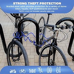 Maximum security and theft protection. Steel cable provides protection of property against theft. Braided steel coiled security cable with looped ends are encased and secured with a thick steel collar. Secure a variety of items: gates, bicycle, bike lock, kayaks, surfboard, paddle boards, generators, power stations, grills, outdoor equipment, camping equipment, scooter, tools, tool boxes, ladders, garages, patio furniture, chairs, motorcycles, ATVs, coolers, sports equipment and more! Weatherproof and corrosion resistant materials. Constructed of marine grade weatherproof steel. Vinyl coated to provide protection against the elements and prevent scratches to the secured item. All weather performance ideal for indoor and outdoor use. Use as a bike lock for your bicycle, kayak lock, and more. Versatile security. Looped ends are compatible with multiple lock types – u-locks, disc locks, padlocks and more. Pair this security cable with the lock of your choice. Easy to use and compact. Coiled cable allows for easy storage and prevents excess cable from dragging while in use. Steel cable is flexible and easy to wrap around and secure the object you are protecting against theft. Specifications: Width: 10mm Diameter; Length: 5ft. Item is backed by an American company with easy-to-reach customer service. If you have any questions or experience any issues, we are here to help. NOTE: Security cable only, no lock included.