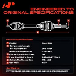 [Vehicle Fitment]: Compatible with Chevrolet Equinox 2010-2015 L4 2.4L, Equinox 2016 L4 2.4L (1st Design); Compatible with GMC Terrain 2010-2015 L4 2.4L, Terrain 2016 L4 2.4L (1st Design) [Reference Number]: 15934402, 20906475, 15934401, 20881990, 20906474, NCV10641, NCV10642, 661516, 66-1516, 661517, 66-1517 [Specifications]: ① Location: Front Left and Right (Driver and Passenger Side); ② ABS Ring Included: No; ③ Axle Nut Included: Yes; ④ Spindle Nut Thread Size: M24 x 2.0; ⑤ Compressed Length: 26.54 inch (Left), 22.44 inch (Right); ⑥ Input Shaft Spline Count: 34 (Left), 27 (Right); ⑦ Output Shaft Spline Count: 30 [Function]: CV axles serve as the final link between the engine and the wheels, transferring power from the vehicle's transmission and differential to the wheels to drive the vehicle forward [Buy with Confidence]: A-Premium offers a one-year unlimited-mileage guarantee on our meticulously crafted CV axles. We offer a wide variety of automotive accessory categories, ensuring that you can hit the road with peace of mind