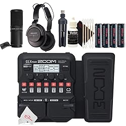 - Key Features at a GlanceOver 70 built-in effects13 amp models for simulating classic rigsUp to 5 effects can be used simultaneouslyChain effects together in any orderBuilt-in expression pedalChange sensitivity of expression pedal via the menu and displayTweak physical response of expression pedal with a 5mm hex key (available separately)Looper records up to 30 seconds depending on BPM (64 beats of CD-quality audio with seamless start and end times) ZOOM Guitar Lab software for creating, editing and managing effects and patches68 built-in rhythm patterns, which can be used in conjunction with the Looper50 memory locations for storing user-created patchesAuto save function for automatic saving of all patch parametersOnboard chromatic tuner supports all standard guitar tunings, including open and drop tuningsInput jack accepts standard mono guitar cable Both active and passive instruments supported)Auxiliary input jack for connection of personal music playersOutput jack for connection to amp or headphonesRuns on 4 AA batteriesAlkaline battery life of up to 18 hoursUSB port for firmware updates, power, and connection to ZOOM Guitar LabIn the BoxZoom G1X Four Guitar Effects Processor with Built-In Expression Pedal4 x AA BatteriesThis Kit includes the following:Zoom ZDM-1 Podcast Mic Pack Accessory Bundle Batteries 3pc Cleaning Kit