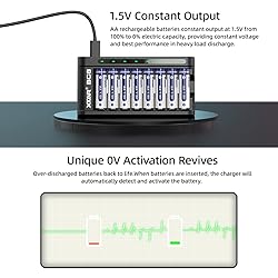 Why develop the BC8 charger? : More and more people use 1.5V batteries to replace 1.2V NiMH batteries. XTAR's original development plan is to make a single 8-slot 1.5V lithium battery charger. Considering many people still have a large number of 1.2V NiMH batteries, , It’s also design perfectly suited for topping up 1.2V Ni-MH cells .So you can keep using the batteries you already have and be future-proof at the same time. Why 1.5V Batteries ? : Replacing your single-use AA and AAA batteries with rechargeables is a quick and easy way to lower our environmental footprint. The long-lasting power in the latest XTAR Li-ion batteries means that you get improved performance while reducing up to 30 times less pollution compared to alkaline cells. An ultra-stable 1.5V output for heavy-load devices,Super fast charging time of 1.5 hours to full top-up, 1000+ life cycles for exceptional longevity. What to do with the old 1.2V NiMH : This charger can charge 1.5V lithium battery and 1.2V NiMH battery at the same time, 8 slots can be mixed at will. It can also revives your over-discharged batteries, with over-voltage protection, over-current protection, short-circuit protection , over charged protection, your batteries are in good hands for many years of dependable usage. With 1000+ cycles and lightning-fast charging times of under 2 hours over 8 slots, both your wallet and your patience will thank you. XTAR BC8 is the only charger you need to efficiently power all your smart-home devices and electronic products. What you get: BC8 Charger +QC3.0 Charger( Can charge both 1.5V liion battery and 1.2V NIMH Batteries), if you have any question please let us know via amazon , we will solve it within 24h.