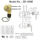 • Zing Ear ZE-109M Specifications Item : ZE-109M Material: Metal Type: 2-Wire light switch Function: ON-OFF Switch Type: Pull chain switch Specification: 6A 125VAC – 6A 125VL – 3A 250VAC Certifications:UL approved (USA) - CSA certified (Canada) Dimensions (approximately): 0.82 x 0.82 x 0.56 inch Color: Available in Brass, Brass(Gold)