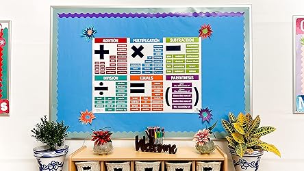 Ma𝘁𝗵 V𝗼𝗰a𝗯𝘂𝗹a𝗿𝘆 G𝘂𝗶𝗱𝗲: These educational math posters cover key math operations including addition, subtraction, multiplication, division, equals, and parentheses with related terms to strengthen conceptual understanding. It helps students identify operation keywords quickly E𝘅𝘁𝗿a-La𝗿𝗴𝗲 D𝗶𝗺𝗲𝗻𝘀𝗶𝗼𝗻𝘀 – Measures 13.5" x 39", making a bold statement in any space while remaining easy to see from across the room. These math symbols posters for classroom are designed to capture students' attention and support their math learning journey. Fits perfectly on a 2' x 3' bulletin board with borders. P𝗿𝗲𝗺𝗶𝘂𝗺 Pa𝗽𝗲𝗿 C𝗼𝗻𝘀𝘁𝗿𝘂𝗰𝘁𝗶𝗼𝗻 – Our math posters are printed on heavy-duty 100 lb poster paper with photo-quality brightness similar to premium photo paper, delivering stunning visual contrast and color. C𝗵a𝗿𝘁𝘀 𝗳𝗼𝗿 A𝗹𝗹 G𝗿a𝗱𝗲𝘀: These math operation posters are designed for 1st, 2nd, 3rd Grade, 4th, 5th grade. Designed for elementary & middle school grades - also perfect for daycares, libraries & learning centers.Designed for elementary & middle school grades C𝗼𝗹𝗼𝗿-C𝗼𝗱𝗲𝗱 S𝗲𝗰𝘁𝗶𝗼𝗻𝘀 𝗳𝗼𝗿 Fa𝘀𝘁𝗲𝗿 R𝗲𝗰𝗼𝗴𝗻𝗶𝘁𝗶𝗼𝗻 – Each math operation is grouped in a distinct color, allowing students to quickly differentiate concepts, improve focus, and retain information more effectively during lessons and problem-solving practice.