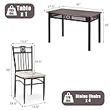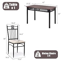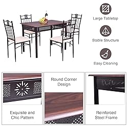 【5 Pieces Dining Table Set:】This set consists of 1 dining table and 4 upholstered chairs, providing a perfect gathering place for 4 people to enjoy pleasant meal time. Besides, the chairs can be tucked under the dining table when not in use, which frees up more space. 【Built for Comfort: 】The combination of thick sponge padded cushion and breathable fabric helps you achieve optimal comfort and relaxation when you sit on the chair. The ergonomically shaped chairs come with elegantly curved silhouette that perfectly fits your body curve for the purpose of relieving back fatigue. 【Good Quality & High Reliability:】Made of power-coated steel frame, the dining table set features great sturdiness and high strength for worry-free using. The MDF tabletop promises longer service life while the non-slip foot pads on the bottom prevent the floor from scratches. 【Exquisite Craftsmanship:】The natural wood grain and black metal texture match seamlessly with interior decoration and show great taste. Moreover, this dining table set with cutout pattern makes an instant upgrade in style and adds a refined sensation to any place, such as home, restaurant, coffee shop, etc. 【Hassle-free Assembly & Cleaning:】All necessary accessories are included. Under the guidance of detailed instruction, you can put all the part together without effort. Smooth tabletop surface is easy to clean and maintain, which can be wiped with a damp cloth.