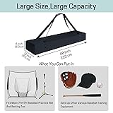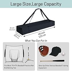 • Dimensions:48 x 12 x 6inches.Our softball net replacement bag fits most 7ft by 7ft bow style training net systems. You can put two or even three complete 7ft×7ft training nets.Other training equipment,such as batting tee,gloves,baseball cap,bat and ball,can also be put into the bag.Large storage space helps you pack more equipment. Using our softball net replacement bag to store and carry baseball net and other sports equipment can avoid unnecessary wear and tear of sports equipment,so as to ensure the safety of gear.You can carry your sports equipment to the training ground and our bags provide daily security for your precious baseball practice gear. Baseball net bag is made of 900D encryption polyester material,so it is waterproof and can be used outdoors on rainy or snowy days.If the bag is dirty,you can machine wash it directly.Meanwhile,net replacement bag also has good abrasion resistance,so the pole of the net will not puncture the bag and the bag will accompany you season after season. Sturdy polyester webbing shoulder straps and PU anti-cutting comfortable handles allow you to quickly and easily carry your practice net on or off the court.Our straps are sewn with double thread encryption to ensure high load bearing.At the same time, when you don't use the bag, you can easily fold it without taking up space. Our softball net replacement bag is the perfect addition to your outdoor and indoor solo or team baseball/softball training.You can take net replacement bag with carrying multiple nets and the associated hardware anywhere,such as the backyard,ball park or trainning center.It is suitable for baseball fans,players and coaches.