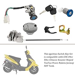 - Product Features: Brand New, high quality Ignition switch key set. High performance, durable in use. Ignition Switch Key Set,3 position switch:on/off/lock Plug with 5 pins Comes with complete Ignition switch key set. Compatible with GY6 49cc 50cc Chinese Scooter Moped TaoTao Peace Roketa Jonway NST Tank. Easy to install, but professional installation is recommended. Package indcluding: key ignition with 5 wires,set of 2 keys,gas tank cap lock,seat lock and mounting clip,seat latch and cable assembly