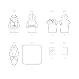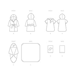 Babies' sewing pattern packet comes with sewing templates, fabric recommendations, pattern pieces, sizing guides, and instructions for (1) complete bath set Babies' bath set sewing pattern templates for baby sizes 2X small, extra small, small, medium, and large Baby's bath set has a hooded robe with bias tape trim, stitched down front ties and back elastic casing; pull-over hoodie is trimmed with bias tape; hooded towel wrap and hand wash gloves are finished with bias tape and purchased appliques Simplicity pattern sewing templates are proudly designed and printed in the USA