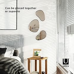 Glass MODERN, ORGANIC SHAPE: Pebble's soft, organic shape adds dimension and whimsy to your space, while still remaining modern in design MOUNTS WITH ADHESIVES: These Pebble Mirrors are easy to install and come with strong adhesive strips to customize placement THIN METALLIC FRAME: Pebble Mirror measures 24 x 36 inches and features a thin metallic frame MAKE A STATEMENT: Group with the Pebble 24x36" Mirror (sold separately) for a visually interesting arrangement with maximum impact MODERN ORIGINAL DESIGN FOR EVERY HOME: From reimagining the functionality of home essentials to creating innovative new decor, Umbra products add personality to your home. Don’t settle for copy-cat products. Choose Umbra and get the original.