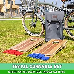 2 FT x 1 FT TRAVEL CORNHOLE: Complete 2 ft x 1 ft cornhole set similar in quality and craftsmanship to full size regulation sets but in a fun portable size; Significantly easier to take camping, to the beach, lake, and more PREMIUM QUALITY: 100% wood construction featuring premium birch wood surface with professionally stained artwork for a clean modern look BACKPACK CARRY CASE: Heavy-duty retro-inspired canvas backpack conveniently stores the complete game set for travel; Stylish backpack features adjustable straps and faux leather patch STICK & SLIDE BEAN BAGS: Includes 8 mini size 4 in x 4 in stick and slide bean bags, canvas side (for sliding) and suede-like side (for stopping) for complete control over every throw SOCIAL EVENT FAVORITE: Makes a great lightweight alternative to heavy regulation cornhole sets or as secondary set easy to take on the go; Hours of fun with friends and family at campsites, cookouts, holiday weekends, and more