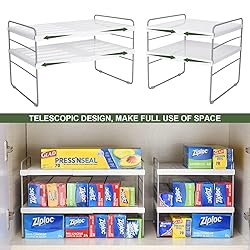 PANTRY ORGANIZATION AND STORAGE RACK: 2 pack kitchen pantry organization and counter-shelf organizers will help you maximize your space and enable you to organize all your necessities in an orderly manner and keep your kitchen or bathroom tidy. This would be the perfect mothers day gifts. ADJUSTABLE & EXPANDABLE DESIGN: Our expandable foil and plastic wrap organizer can be extended from 9.8" to 15.6", and can be adjusted to four different heights (3.9 to 8.9 inches) to maximizes storage area and vertical space, flexibly adjusted to meet different storage needs. EASY TO ASSEMBLE & REMOVED: Our kitchen counter wrap organizer shelf is snap assembly design, doesn’t require any tools installation, is easy to assemble in minutes. You can simply place it wherever required. It can easily be moved or even removed for a new arrangementm. STURDY & NON SLIP: kitchen long box organizer is made of premium metal (finished with rust-resistant coating ) and high quality, BPA-free HIPS plastic, Holds up to 40 pounds. It has a non-slip surface and non-slip feet to keep hold shelf in place and prevent items from sliding. VERSATILE PURPOSES & RELIABLE CHOICE: This kitchen cabinet shelving great for use them in bedrooms, under kitchen and bathroom sink , pantry, counter, closets and cupboard, even refregiator, etc. Can also be used as camping or RV storage. You can store your bottled spices, cans, jars, toiletries, cleaning and kitchen utensils. We offer a 180-day easy return policy, and 100-% satisfaction guarantee, We will be happy to assist you with any issues or difficulties you encounter.