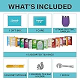 Modern Elegance Tea Gift Set, Includes 15 Teas, Stainless Steel Tumbler, Honey Straws, Tea Spoon Squeezer, Squirrel Tea Bag Holder (Purple)
