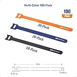 Manage your cables with a 100-pack of reusable cable ties in a hook-and-loop style; Cable ties reusable utilize a nylon wrap and hook for secure installation and damage-free removal, enabling reuse of each wire tie Cable management cord ties are perfect for taming cable clutter; Cord wrap can be used around the TV, PC, gaming room and more to tie together cables for seamless connectivity; Prevent tangled cords with cord wraps, or build the perfect PC with computer cable ties and PC cable ties for cable organization Hook and loop cable ties are simple to use; Simply wrap the strap around cables, hook the tie through the guide, and secure the nylon wrap to the strap; Reusable design ensures the cable management straps can easily be removed without damaging the reusable wire ties Strong, secure cable straps are perfect for securing messy cables behind televisions, desktop PCs, workshops, and other areas with cables of different types; Cord ties are suitable for power cords, network cables, A/V cables and more; Use the zip ties for electrical cords to separate power cords for A/V equipment, computer equipment, and more; Cord ties for electronics are perfect for desktop PCs and video game consoles The package of multi-colored cable ties provides a means of easily identifying cables; The package includes 60 black, 20 blue, and 20 orange wire straps
