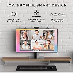 Present your best with a HumanCentric video conference light, single light kit. Improve your computer light for video conferencing, Zoom calls, streaming video, and online class. Single light kit is one video light with one power cable. Make sure you don't have a light or a window behind you, as your face won't look bright enough. This is because the camera is compensating for the bright light behind you by making the whole image dark. Webcam lighting for video conferencing provides a more professional appearance and streaming presence: Get the ideal video call light to match your skin tone and environment. Add a Zoom light to improve engagement over video meetings. Perfect for anyone who wants to look polished and confident on camera, illuminating your face evenly. Easy set up and removal: The monitor or laptop light sits on top of your screen with a webcam style stand. It is meant for stationary use and does not use unreliable suction cups or damaging adhesive just for a computer video light. Position your camera first then add the monitor lights. Preinstalled diffuser provides a soft light panel for a more natural glow and appearance. Look your best on a video call with a proper video conference lighting kit. Adjustable brightness and temperature. Includes cable clips and Velcro straps. Important notes: The light does not contain a battery. Power adapter not included. Must be plugged into a USB-C or USB-A port to function. USB-C to USB-A adapter included. You may need a USB wall adapter (not included) for full brightness if your USB-A port’s power delivery is low. Add-On light does not include power cable and only functions WITH a Single or Double light kit. The maximum space between connected lights is 30 inches. Expandable up to four lights: Daisy chain up to four total lights for more immersive lighting for video recording. Important note: Due to power delivery limitations of USB-A, we do not recommend powering more than two lights with a USB-C to USB-A adapter.