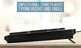 Full-Size Layout: Offers 104 chocolate style keys, including navigational controls, full functions and a 10-key numeric keypad. Also Includes key status indicators for Num Lock, Caps Lock, Scroll Lock functions Spill-Resistant: You do not have to worry about damage to your keyboard and its functionality when spilling liquid on it. Keyboard supports up to 8 million keystrokes; extendable feet for more ergonomic typing Quiet Wired Keyboard: no batteries required; built-in 4.5 ft. USB-A cable channels power to the keyboard so clicks register quickly. Key clicks feel good and keystrokes are responsive while keeping the noise to a minimum Easy Use: Plug-and-play installation through any USB-A port on your Windows and Linux computer; great aesthetic appeal to your current computing setup 3 Year mfg Warranty