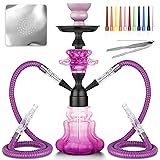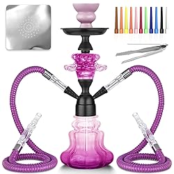 14'' Hight Glass Base Little Hookah Complete Set. HOOKAH WITH EVERYTHING: The package includes 1 hookah glass base, 2 hoses, 1 center pole with glass accessories, 1 downrod, 1 ash tray, 1 ceramic bowl, aluminum foil, disposable tips, all hookah grommet, and 1 clip. EASY TO ASSEMBLE: You only need 1 minute to set up our hookah very easily, the convenient hookah construction is a good companion for you on the go. SHAREABLE 2 HOSE HOOKAH: Compared to the traditional 1hose hookah, this hookah is upgraded to 2hose, which can be used by 2 people at the same time and has big cloud to share it with your friends. BEST GIFT: Suitable for parties, picnics, camping, bars, whether you are a beginner or a hookah lovers, this hookah is the perfect choice, fashionable shape and design, big clouds, bring you great fun. 100% RISK-FREE PURCHASE - If there is any problem with your small hookah set, you can contact us for a refund or replacement within 90 days. We offer 24-hour English-speaking online service!