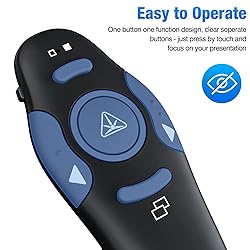 【Plug & Play Red Presentation Pointer】Simply plug in the usb receiver into a USB port of your laptop or computer to begin. The slide clicker is with a bright red light, easier to draw audience’s attention, red light range can reach up to 600ft, and the 2.4Ghz range of it can reach up to 115ft, you can walk around the room while controlling slides even far away from the host device (Not Recommended for LED/ LCD/ TV screens) 【Long Rechargeable Working Time】 Built-in 300mAh rechargeable lithium battery, this presentation clicker with laser pointer only requires a 2.5h charging time and holds a charge for weeks. An essential presentation tool in the classroom or office 【Features of Rechargeable PowerPoint Remote】Powerpoint clicker with laser pointer serves the basic functions via the press and double-press and hold features of page up/down, full/black screen, laser control, easy to use in presentations 【Widely Compatible】Wireless presenter remote supports systems: Windows, Mac OS, Linux, Android; Clicker for laptop presentations supports software: PowerPoint, iWork (Keynote & Numbers & Pages), Prezi, MS Word, Excel, ACD See, Website and etc 【More Design Details】The slideshow clicker is with an intuitive button layout so that you can locate the button without having to look down at the unit. USB receiver is conveniently stores inside the bottom of presentation remote when not in use