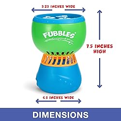 • The Fubbles No Spill Funfiniti Bubble Machine provides up to 1 hour of nonstop bubble making magic before needing to be refilled. The Fun-finiti Bubble Machine features 3 No-Spill bubble blowing wands for maximum bubble output without any messy spills and a reservoir that holds 20 fluid ounces of bubble solution! With less refilling, more bubble magic, and no spills, this reimagined bubble machine is sure to delight kids and parents alike. This Amazon Toy Exclusive Set Includes 2 fluid ounces of premium bubble concentrate and 16oz of additional bubble solution. The machine works well with either concentrate or solution. This toy does not include any music sounds or lights, making it a great sensory toy as it is not overwhelming as children begin to learn. Children learn through play and our toys set out to enforce those skills. Requires 4 “AA” batteries, not included. Ages 3 years+
