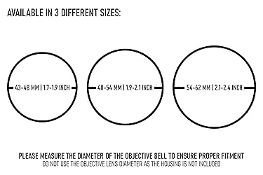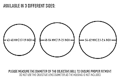 • The newly designed Monstrum Flexible Fit Scope Sunshade attaches seamlessly to your rifle scope to shield your sight picture from glare and sunlight.The sunshade secures to the objective bell of your scope via a flexible rubberized sleeve allowing for compatibility with a range of sizes and scope models, eliminating sizing and compatibility issues. Available in a range of sizes to fit any rifle scope model with an objective bell diameter of 43mm and up. For optimum fit, carefully measure the OUTSIDE DIAMETER of both your rifle scope’s eyepiece and objective bell. Please note that this measurement is different than the diameter of your objective lens.Objective Lens Cover with attachable sunshade available in:43-48 mm | 1.7-1.9 inch diameter48-54 mm | 1.9-2.1 inch diameter54-62 mm | 2.1-2.4 inch diameterRefer to our sizing chart and sizing video to ensure the proper size and fit.
