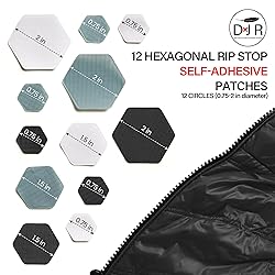 - Hexagonal-shaped down jacket repair patches - super-strong and super soft - these patches are quick, easy to apply and make an unobtrusive and lasting repair that doesn’t spoil its softness and feel of your down jacket or sleeping bag. Each kits contains 12 patches, in three colours; 3 x 1"; 3 x 3/4" and 6 x 1/2". We offer a wide range of colours, either try for the closest colour-match you can find or be “bold” and go for a funky contrast! (Due to the variety of colours and fabrics out there, we obviously cannot guarantee an exact match, and those shown on this site are approximations only)
