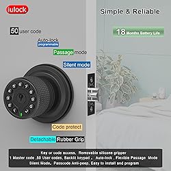 [Keyless Entry & Stylish]✅This keypad door knob lock assigns up to 50 customizable 1-15 digit codes for family or stuff to experience convenience. The knob has perfect size,come with detachable silicone grip,more snug on handle.Ergonomic design can bring trendy style to modern residential and commercial exterior & interior doors.,suitable for screen, wooden and metal doors,etc. [Premium Security & Durable]✅This electronic code door knob adopts heavy-duty design, sturdy and durable. solid lock cylinder with 2 keys that are compatible with most mechanical keys. Premium metal construction, Plating Finish. It offers the best protection against burglary or break-in. Ideal for home, rental, office, hotel, garage, and apartment, etc. [Feature-rich & Smart]✅The keypad of this door handle has clear numbers and soft backlight, so it can be operated day or night. You can activate passage mode when you don't want it locking. Enable silent mode if you don’t want to disturb. 4 AAA batteries can be used for 18 months,low battery alarm. Use type-c USB backup in case that batteries run out. [Fits most doors]✅This password doorknob fits 1-3/8" to 2-1/2" thickness doors, with a 2-3/8" or 2-3/4" adjustable latch. options rosette rubber seal suitable for more door, Install it by yourself with just a screwdriver in minutes. It is suitable for left or right-handed doors of your bedroom ,front door entry and backdoor, etc. [Reliable & Trusted Warranty]✅IP65 weather resistance. Quality materials and industrial circuit design ensure this door lock reliable. Can work in extreme environments (works great from -22F to 176F, rain and sun) They are awesome gifts for the people you love. Each IULOCK door lock comes with long-term warranty and 7X24 Efficient service.