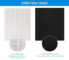 D480 Replacement Filter Fit Model: Compatible with Winix D480, Part number 1712-0100-00. D480 Replacement Filter D4 Accessaries: 1 Pack Filter , 3 Pack Activated Carbon Filters,1 Cleaning Brush. Active carbon filter: capture hair, pet fur and cotton velvet, extending the life of the real filter, and absorbing family smells such as pets, cooking, smoking, etc. TRUE D480 filter: real filter can capture 99.97 % of air debris to 0.3 microns to create fresh and pure air for you and your family. Easy to replace: no tools required. Replace True filter every 12 months and Activated Carbon Filter every 3 months for optimal performance.