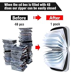 - Siveit High Quality Black 48 Capacity Lightweight Carrying CD/DVD Case Wallet Our Siveit CD case does its job very well. Moisture and strong plastic +PP film + non-woven fabric case design is durable enough to store it anywhere without worrying about your CDs being crushed and scrached. It is compact and portable, holding 48 CDs or DVDs with zippered closure without being super big and bulky. 1.CD CASE SIZE:6.1x6.1x2.8 inch(LxWxH) 2.Provides Maximum Protection from Dust, Scratches and other Disk Damage. 3.Organizer holds 48 CDs,The already pulled out tabs make it easy for you to slide your discs right into the pockets. 4.Transparent Sleeves for Improved Media Organization. 5.Total: 1x Siveit Black 48 Capacity CD/DVD Storage Case ATTENTION: ATTENTION: We have upgraded our CD Bags, it holds 48 CDs, and the zipper can be closed easily and perfectly If you're not satisfied with this CD case, please contact us to refund your money or replace a new one.