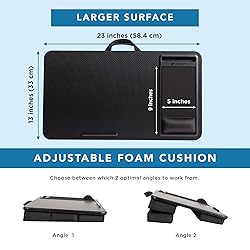 Generous Workspace: 23" × 13" surface fits laptops up to 17.3" and provides ample room for work or study essentials. Ergonomic Design: Adjustable cushion ensures the perfect incline for neck and back comfort. Wrist & Mouse Support: Memory-foam wrist rest and deep mouse pad reduce strain during extended use. Organized & Convenient: Built-in phone slot and device ledge keep essentials within easy reach. Portable & Easy to Carry: Lightweight design with a carry handle lets you work or relax anywhere.