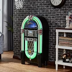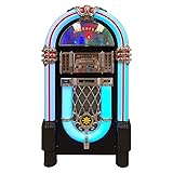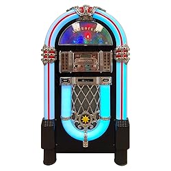 - Design: Bring the retro charm of a 1950's American diner right into your home with this beautifully designed jukebox. Versatile: This jukebox has a belt driven player with auto-stop function, a USB port, MP3-compatible CD player, and a SD slot for music playback and recording function. A Bluetooth interface also allows for music playback from a smartphone, tablet or laptop. Infinite possibilities: Whether your music is old or new this jukebox offers various possibilities to make your day more musical. A large number of playback options to choose from allow for you to listen to your whole music catalogue. Versatile: This jukebox has a belt driven record player with auto-stop function, a USB port, MP3-compatible CD player, and a SD slot for music playback and recording function. A Bluetooth interface also allows for music playback from a smartphone, tablet or laptop. Memory: The jukebox also comes with a FM radio that has memory storage for up to 20 stations. There is also an AUX input for wired audio devices and line output for signal transmission. Infinite possibilities: Whether your music is old or new this jukebox offers various possibilities to make your day more musical. A large number of playback options to choose from allow for you to listen to your whole music catalogue. Design: Bring the retro charm of a 1950's American diner right into your home with this beautifully designed jukebox. Connected: 1 x USB port, 1 x SD memory card slot, 1 x 3.5mm jack AUX input, 1 x stereoRCA line output | RCA line output | Bluetooth version: 4.0