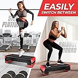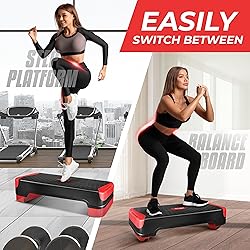 42.5-INCH LENGTH X 16-INCH WIDTH ANTI-SLIP STEP SURFACE: Slip-resistant, shock-absorbing aerobic step platform with four additional removable 16” x 16” x 2” risers provide a steady, safe, space-efficient and comfortable step workout experience EASY HEIGHT ADJUSTMENT: Intensify workout difficulty by adjusting platform height from 4” to 6” to 8” using risers to challenge yourself and burn more calories HIGH-DENSITY POLYETHYLENE MATERIAL: Constructed of recyclable high-quality polyethylene capable of supporting up to 300 pounds. Ideal for indoor and outdoor use VERSATILE STEPPER PLATFORM: Ideal for cardio workout, fitness, low and high-impact. Can combine with other fitness tools to get extra burning fat workouts MULTIPLE BENEFITS: Offers you a multitude of health benefits such as helping you burn fat, lose weight, tone and retain your body as well as improving your cardio
