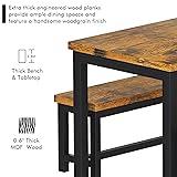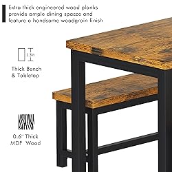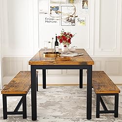 【FITS A FAMILY OF 4-6】The dining table set for 4 includes 1 rectangular table and 2 benches. 47in by 29in spacious tabletop provides ample space to put items.The 41in by 12in large benches offer space for 4-6 people.Retro brown wood grain finish and black metal frame add a modern industrial touch to a classic design, perfectly used in the kitchen, living room, party room, restaurant etc. 【DURABLE AND STURDY】Dining table with bench is made of upgraded MDF wood laminate which can support an indoor party of 4 or more,well made and solid, waterproof and anti-scratch; the legs are made of heavy duty powder coated thick steel, which ensures stability and durability.Each seat can hold up to 500 lbs (4 adults or 2 adults and 4 children), while the table boasts a high 300 lbs capacity. 【SPACE SAVING】There are ample spaces beneath the table for your legs and the benches can be tucked away neatly under the table when not in use.The space saving design can also prevent you from unexpected tripping when you are delivering cuisine dishes to the kitchen dining tabletop. You can slide them out for quick seating. It can be a writing table,breakfast nook or a kitchen table, perfect for those who have a limited space. 【ADJUSTABLE FOOT PADS】The 3 piece soho dining room table is equipped with foot pads to prevent floor from scratch and keep more stability. It also can be put on an uneven floor because of its adjustable feet pads . (Adjust the knob to change the degree of the metal leg so that it can be used on carpet or uneven floors .) 【EASY TO ASSEMBLE AND CLEAN 】Equipped with necessary tools and clear detailed instruction to guide your fast installation. No need for any other special tools.More, the smooth surface is waterproof and easy to clean, you can wipe off the dust and soup easily with a wet cloth.Considerate Service: Any questions about the quality of product , contact us , we will respond you within 24 hours.