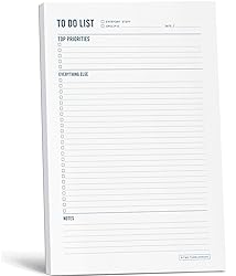 • Our minimalist notepads are designed to be a simple solution to help you easily plan your life, stress less, and be happier and more productive. The To Do List Notepad features top priorities so you don't get distracted by busywork, plus notes and a to do checklist so you don't forget any of your daily tasks. The versatile design can be used for home, office, honey do list, school, chore lists, to organize projects, to delegate tasks. Can be used for mundane daily tasks or important projects. Shopping Lists, Chore List, Packing List, Meal Planning, Party Planning, Errand organizing, or simply making a list of shops to visit, making a list of what you want to do on vacation.