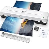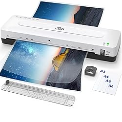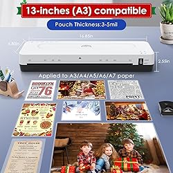 More Efficient: Our laminator machine has 2-3 minutes fast lamination and 355 mm/min(3pcs/min) laminating speed to improve work efficiency by 80%, surpassing most laminators on amazon Thermal and Cold Mode: The "HOT" mode is suitable for documents, menus, and business cards; The “COLD” mode is ideal for items sensitive to high temperatures. Such as paintings, letters, and other precious paper lamination Jam Solution: Push the ABS button of the laminator to quickly pull out the jammed pouch. It can protect the dual rollers and extend the life of the laminator. The constant temp is 239℉-293℉ and decibel ≤55db, Which makes this 11x17 laminator work more quietly and not be too hot Compatible with almost All Sizes: The max width 13inch wide laminating machine is compatible with A3, A4, A5, A6, A7 and the range thickness of lamination is 3-5mil.1 laminate machine can handle all the doc you need, making life easy, and great for teachers to use in the classroom 4 in 1 Laminator Kit: Thermal laminator set with 1 laminator A3(13inch), 1 paper trimmer, 1 corner rounder, 1 instruction manual and 30pcs laminating sheets(5 A3, 5 A4, 10 A5, 10 A6). No bubble and wrinkle-free lamination