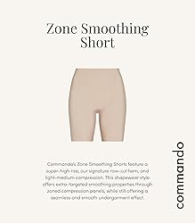 - The Commando Zone Smoothing Short is your secret weapon for sleek, confident dressing. Engineered with targeted compression zones, this high-waisted shapewear short smooths and sculpts where you want control—at the tummy, waist, and thighs—while allowing freedom of movement everywhere else. Crafted with raw-cut edges and seamless construction, the Zone Smoothing Short disappears under clothing, creating a flawless finish beneath dresses, skirts, and slim silhouettes. Unlike traditional shapewear that pinches or rolls, Commando’s design is made from lightweight, breathable fabric with four-way stretch, offering shaping power that feels as comfortable as a second skin. Whether you’re looking for wedding shapewear, everyday smoothing shorts, or a special-occasion base layer, the Zone Smoothing Short is the ultimate foundation piece. Trusted by stylists and loved by women everywhere, it combines Commando’s innovative fabric technology with luxury comfort, so you can look polished and feel amazing from morning to night. Commando has revolutionized the way women experience undergarments and clothing. Founded on the principles of comfort, quality, and confidence, Commando uses innovative fabrics and meticulous design to create pieces that make you feel your best. Our signature raw-cut edges ensure invisible support, while our commitment to premium materials like European microfiber guarantees exceptional longevity. From Commando underwear and bras to slips and shapewear, each piece is designed to fit flawlessly and provide lasting comfort. Many of our products are machine washable and tumble dry friendly, so caring for them is simple. Just double-check the care label on your item for guidance. Discover the Commando difference and experience a wardrobe that inspires confidence.
