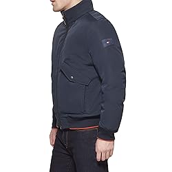 - Stay sleek, stylish and warm with Tommy Hilfiger's Flex Stretch Performance Bomber. This outer jacket is designed with a stand collar, soft rib knit cuffs and hem, and quilted interior lining.