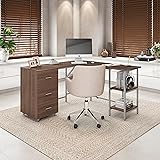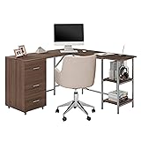 - This L-shape computer desk will add a rustic, contemporary feel to your room while creating an efficient workspace environment. It unifies a heavy-duty steel frame with appealing rich, engineered walnut color wood tabletop that offers spacious space meeting your work needs while you focus on your projects. This stylish and functional L-shaped desk design includes two adjustable open shelves and three side storage drawers to conceal office accessories and documents. This desk's functionality and versatility brings style and organizational appeal to your workspace