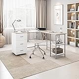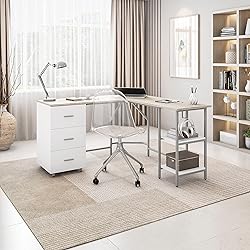 • This L-shape computer desk will add a rustic, contemporary feel to your room while creating an efficient workspace environment. It unifies a heavy-duty steel frame with silver accents and appealing rich, engineered sand color wood tabletop that offers spacious space meeting your work needs while you focus on your projects. This stylish and functional L-shaped desk design includes two adjustable open shelves and three side white storage drawers to conceal office accessories and documents. This desk's functionality and versatility brings style and organizational appeal to your workspace
